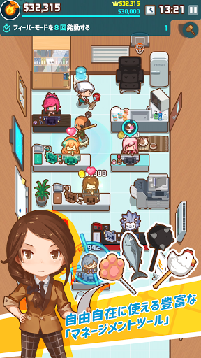 獲得した収益は、夢のビジネス帝国を築き上げるためにどんどん投資しよう。より良い設備をオフィスに追加したり、備品を整えたり、オフィスペットを飼ったり。更には自分のイメージを変えたり「モチベーション維持ツール」を揃えたり。多種多彩なアップグレード機能で会社を次のレベルへ引き上げよう!
