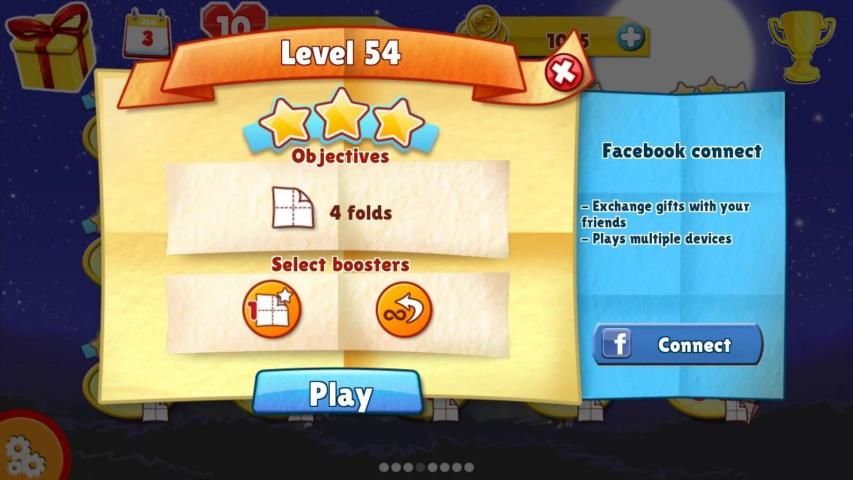 With Origami players can transform a simple piece of paper into a Japanese art masterpiece by following step by step instructions. Fold with precision and in the allotted number of timed steps and then progress to the next level. Players work through various game modes and mini games to earn in game points that can unlock bonuses such as scissors, hints and additional folds. Share your progress with friends on Facebook.