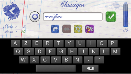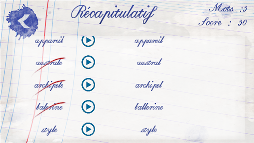 さまざまなエクササイズのモードでスペルをテストできます。提案されている「クラシック」(定義された時刻に再生)または「フォロー」(間違っていることなく、より多くの単語をスペル)することができます。