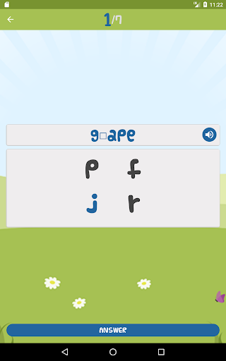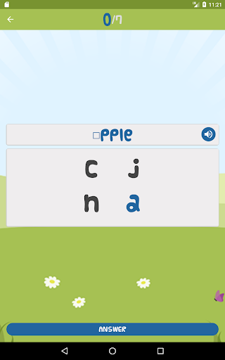 - كل كلمة ينقصها حرف مع وجود ٤ اختيارات وعند اختيار الحرف الصحيح او الخطاء وسوف يظهر حركات واصوات تعرفك على اجابتك حتى لا يمل الطفل واللعبة تكون ومسلية