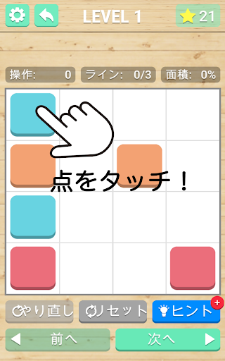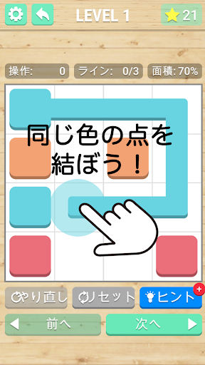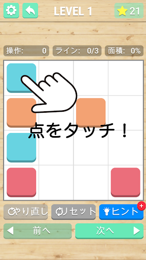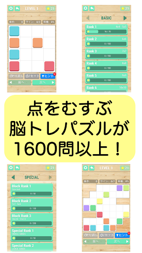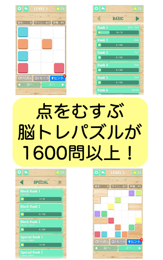 ・同じ色の点を結ぶ、点つなぎ脳トレパズル。 ・1600問以上の問題数。 ・脳トレや暇つぶしに最適です。 ・色の付いた点をタッチし、同じ色の点まで線を結びます。 ・全ての点を結んでください。 ・全てのタイルを埋め、最短の手数で完成すると星が手に入ります。 ・星を貯めると新しいクイズができるようになったり、ヒントの回数が増えます。 ・ヒントを一回使うと、一つだけ線を引いてくれます。