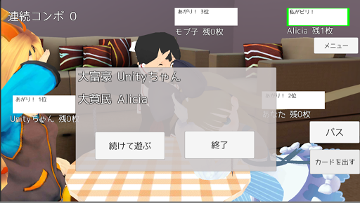 大富豪ゲームは、場のカードより強いカードを出し合って、手札が無くなったら勝ちです。