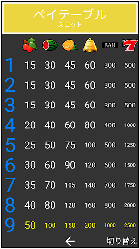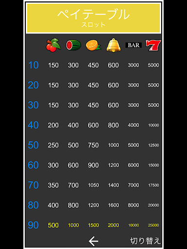 揃う絵柄、当選時の獲得枚数とベット数の対応はアプリ内の「ペイテーブル」を御覧ください。スロットの回転を遅くしたり、再度ベットなしで遊べる特殊な絵柄もあります。
