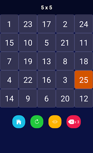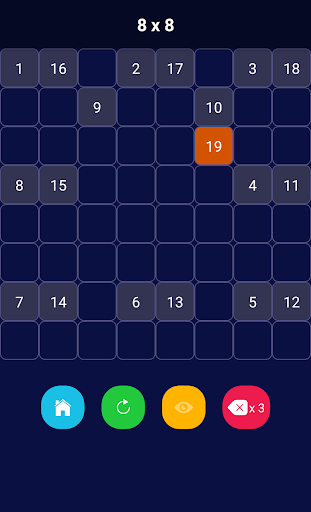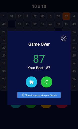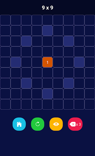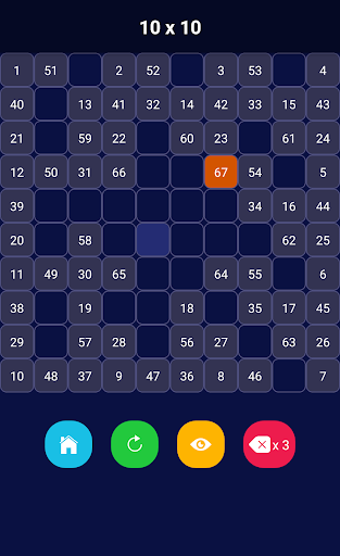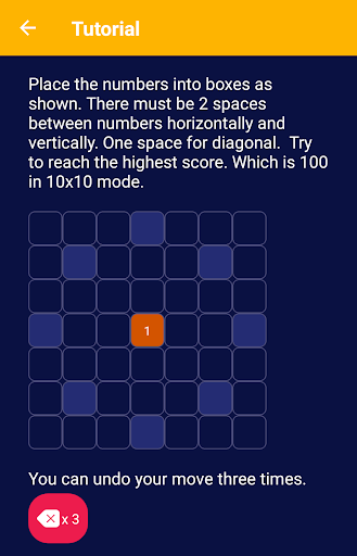 Place the numbers into boxes. There must be 2 spaces between numbers horizontally and vertically. One space for diagonal. Try to reach the highest score. Which is 100 in 10x10 mode.