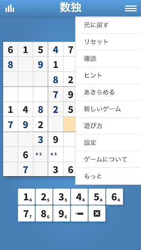 この数独ゲームには、セルの候補の記録、無制限に元に戻す機能、あなたの現状を知ることができる「チェック」機能など、パズルを解くのに役立つたくさんの機能があります。私たちの数独ゲームでは未完成のパズルも保存されるため、いつでも元に戻って仕上げることができます!難易度は、簡単、普通、難しい、エキスパートの4段階に分かれています。