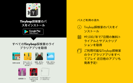 このパスを取得して、Tinybop探検家のライブラリアプリをプレイしましょう。 まずは、これをインストールしてください。 次に、サブスクライブして7日間の無料トライアルを開始します。 6つのTinybop探検家のライブラリアプリをインスト。その他のアプリも近日追加予定!