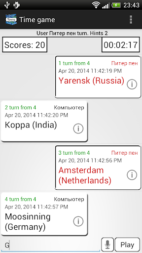 You call city name, and next player (or computer) must call city name that begins on last letter of previous city named