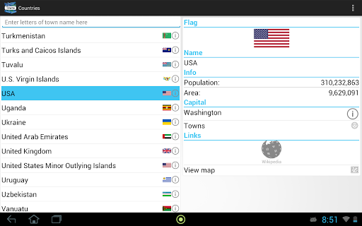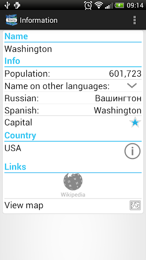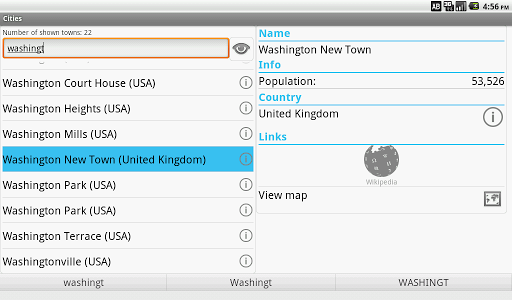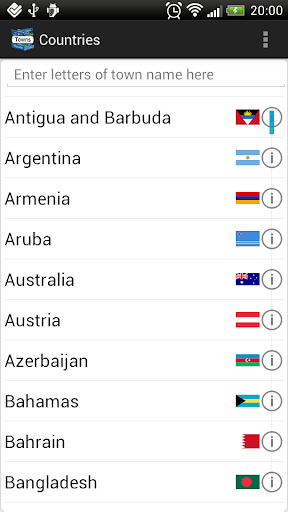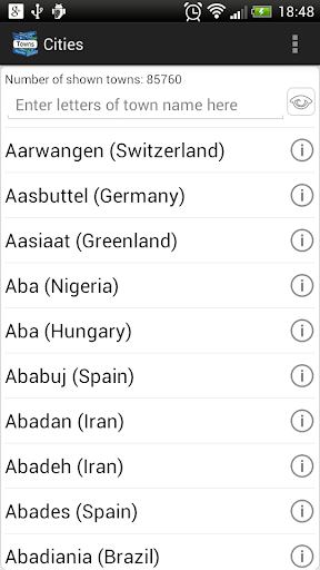 Application contain directory with over 98000 cities names. All world Countries. Detailed information about each town, with links to the more detail on Internet and on Map