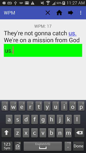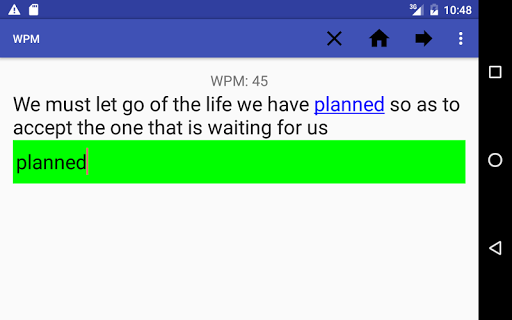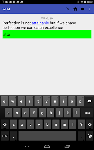 The app keeps track of how fast you type by storing you best score, average score and how many quotes you have completed.