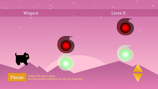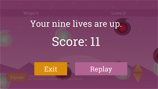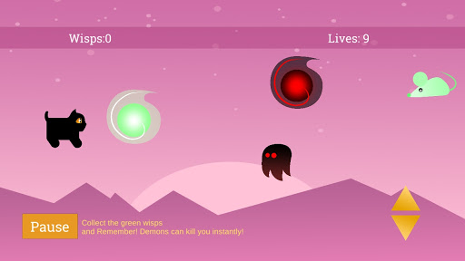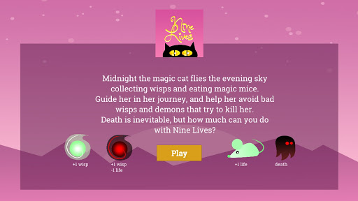 You are Midnight the magic cat. You must fly through the evening sky collecting green wisps and avoiding the red ones that will take your lives. Feed on magic mice that replenish your lives and avoid evil demons that will end you instantly. Death is inevitable but there’s a lot you can do with nine lives.