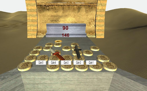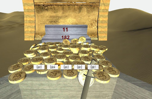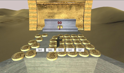 With this push coin game you don't have to wait for coins . You start off with 90. Once a coin falls in the collector it will reward you with 1 or 2 coins and reward you with 1, or up to, 5 points. After you run out of coins you will be taken to a different level. You will go to a total of 4 levels and try to get as many points as you can. If you cause a sword to fall you will get bonus points for that. All of this is for free. No in game purchases needed. It's the full version.