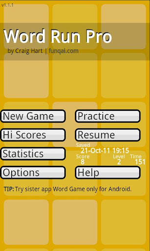 クロックに対して7つのランダムな文字の山からできるだけ多くの単語を見つけます。単語スコアを増やすために、同じ文字セットから「実行」を取得します。