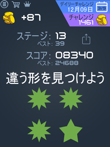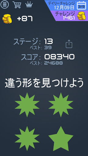 画面上に複数の図形が表示されているので、一つだけ違う図形をタップしてください。しかし、3秒以内にやらないといけません! あなたはどこまで行けるかな?