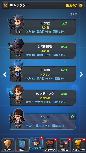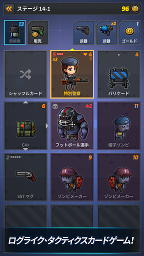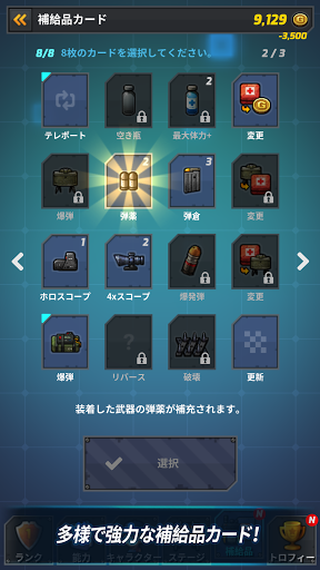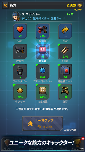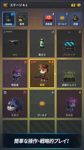 武器、キャラクターの体力、爆弾で敵とバリケードを攻撃し、救急箱でキャラクターの体力を回復しながらゴールドを集めてポイントを上げます。補給品カードを得ながら多くのポイントを上げると、新しいステージやキャラクターを獲得することができます。また、ステージで得られたゴールドでキャラクターの能力、新しい補給品カードのロックを解除することができます。