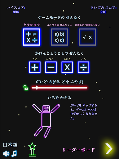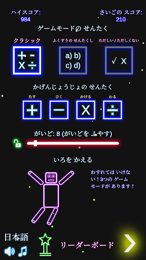 レーザー数学は、レーザーとネオンをテーマにした数学ゲームです。 合計、減算、乗算、除算を練習するために設計されています。
