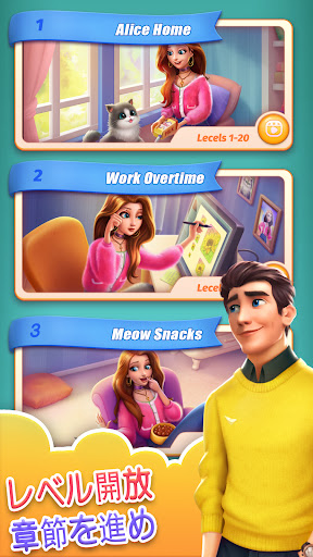 ここではマッチ3パズルを進めて行くと、イベントが進み、アリスとクリスの日常や、クリスと兄のチャールズのアクシデントを楽しむことができる!