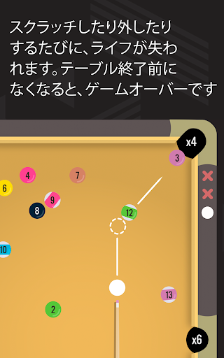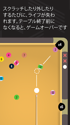 球がポケットに入るたびに、落としたポケットに基づいたポイントがもらえます。ですから、気を付けて落としてください。でも外したりスクラッチしたりすると、ライフを失います。テーブル終了前になくなると、ゲームオーバーです。