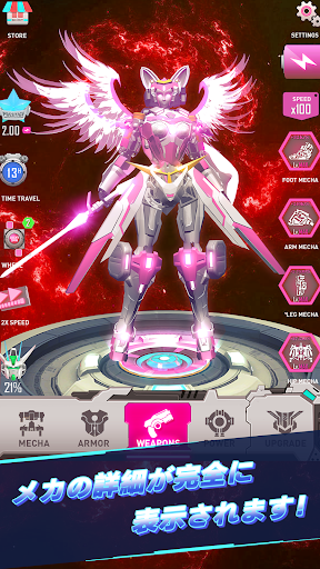 Idle Robotでは、TAURUS-24、ARIES INFINITEなどの数多くのロボットから好きなものを選択して、独自のロボットを組み立てることができます。ゼロからロボット作りを始め、アーマー、武器、ロボットの動力などの様々パーツを組み合わせて楽しむことができます。