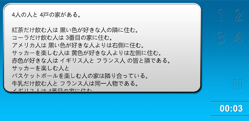 このアプリケーションはこのようなアインシュタインクイズを無限に解けることができ、毎日毎日新しいクイズを置いて全世界の人々が競争して、誰がもっとはやく解けるかをテストしてみることができます。