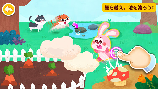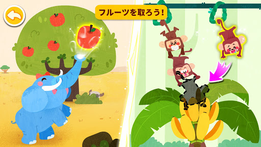 動物たちのお昼ごはんの時間が来たよ。見て。サルたちが縄を滑って、谷を渡ろうとしているよ。バナナを取るんだね!ネコが魚を取ろうとしてうっかり水に落ちちゃった。早く助けてあげよう。キリンのあかちゃんがお腹をすかせているみたい。木の葉を取り、食べさせてあげよう。