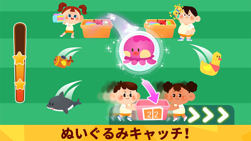 動体視力が試される!仲間がぬいぐるみを落としてくるから、箱を持って、すばやく移動し、位置を調整してぬいぐるみをキャッチするんだ!