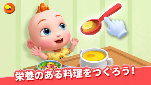 ごはんの時間だよ。JoJoに茶碗むしをつくってあげて!お碗の中に卵を入れてかき混ぜ、電子レンジ入れて蒸せば食べられるよ!あまいフルーツサラダ。JoJoも食べたいみたい!リンゴ、バナナ、いちご、みんな小さく切るんだよ。そして、ミルクの中に入れるんだ。これでJoJoのお昼ごはんの準備は完了!