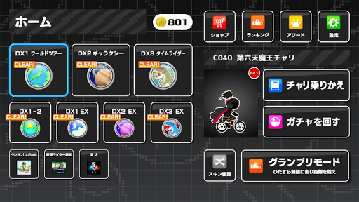 最初はまずチャリ走DXからスタート。チャリ走DX2はチャリ走DX1をクリアすると、チャリ走DX3はチャリ走DX2をクリアすると遊べるようになる。どうしてもすべてのステージをすぐに遊びたいという人は、有料で遊ぶことが可能だ。