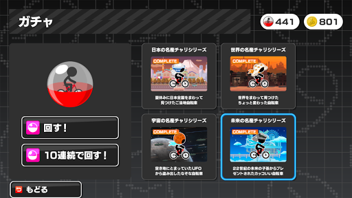 ステージのクリア、ゲームを起動、ハイスコアに挑戦するとガチャチケットが無料で手に入る。ガチャを回しまくり新しいチャリを集めよう。