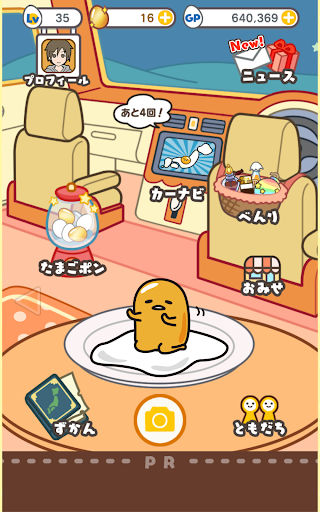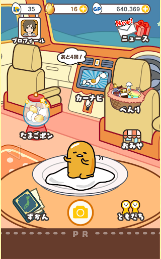 「ぐでたま」をつつくともらえる「GP(ぐでたまポイント)」や「金のたまご」を消費して