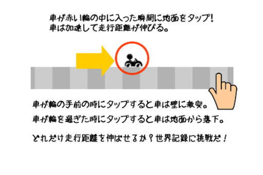 車が赤い輪の中に入った瞬間に地面をタップ! 車は加速してパシリの走行距離が伸び〜る。 どれだけ走行距離を伸ばせるか?世界記録に挑戦だ!