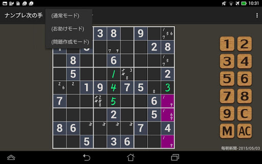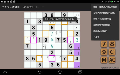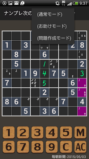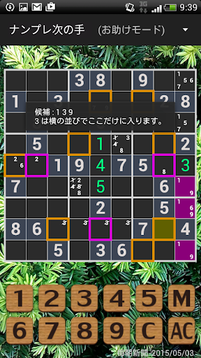 候補の数字を書き込んだり、気になるマスに色を付けるメモ機能があります。(Mボタン)