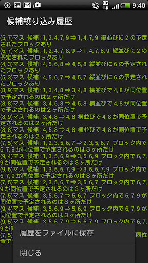 このレベルのときにパズル面の外側を長押しすると、「候補絞り込み履歴」が表示され、表示内容をファイルに保存することもできます。