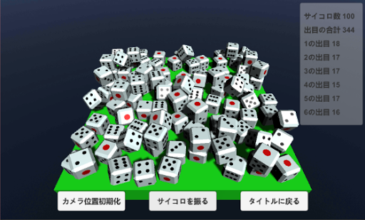 立体的な3Dサイコロです。 1個から100個まで振ることができます。 (機種によっては動作が重くなると思いますので、少ない個数からお遊びください。 画面を上下左右にフリックするとカメラ視点がかわります。 効果音があります。 動作がカクつく時はタイトル画面で音量を最低にしていただくことで多少緩和されます。 ※このアプリはアイコン広告表示するためにインターネットにアクセスします。
