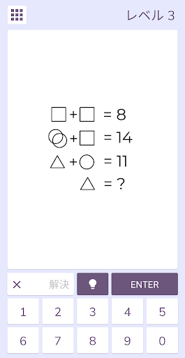 数値間の関係は、幾何学的図形で解決し、最後に不足している数値を完全に解決する必要があります。各パズルとは異なるレベルを持ち、強力な分析的思考能力を持つプレーヤーは、すぐにモデルを知るようになります。