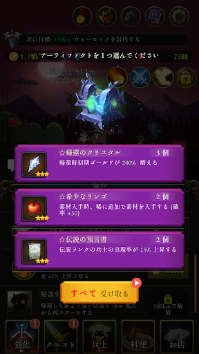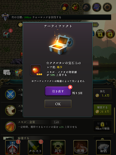モンスターを倒したりクエストをこなすことでコインを稼ぎ、兵士を強化してボスを倒すことで、アーティファクトを集めていこう。