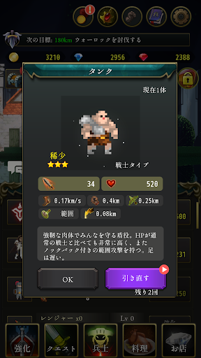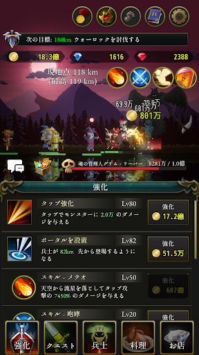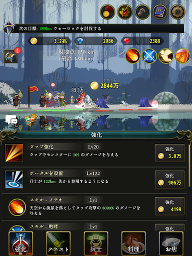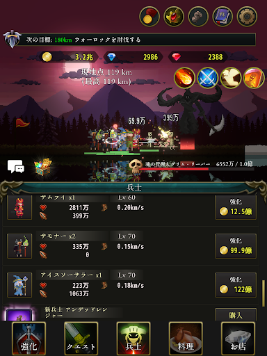 最初は与えられるダメージが 10から100 程度ですが、兵士を強化していくごとに1億、10兆、100京とどんどん加速度的にインフレーションしていきます。ステータスがインフレする気持ちよさを体感しよう。