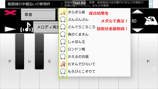 採点モードは、音楽ゲームのように練習曲を演奏した結果を採点するモードです。