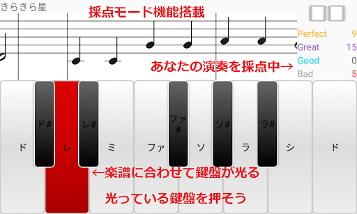 スクロールする楽譜は、鍵盤を押すタイミングで押すべき鍵盤を赤色で表示します。
