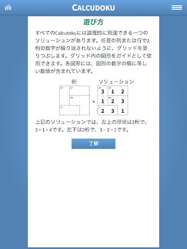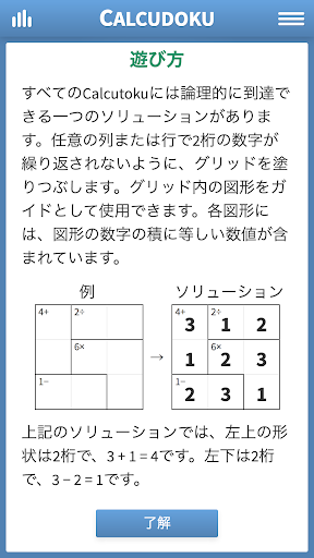 すべてのCalcudokuには論理的に到達できる一つのソリューションがあります。数独のように、列や行に2桁の数字が繰り返されないように記入してください。グリッド内の図形をガイドとして使用できます。各図形には、図形の数字の積に等しい数値が含まれています。例えば、6のセルを含む3つのセルの形状は、1×2×3 = 6というセルの値1、2、および3を持つことができます。エキスパートの方は、最大9×9サイズの大きなグリッドにチャレンジしてください。