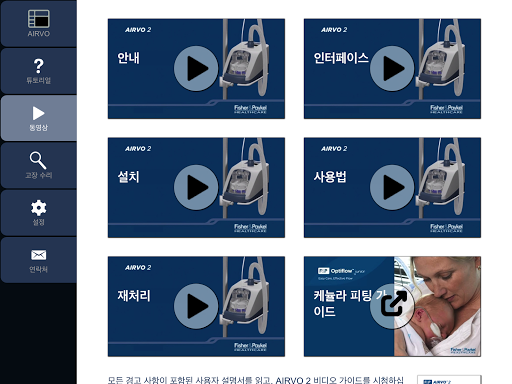 세팅과 산소레벨을 변경하여 경고상황 시뮬레이션을 체험해 볼 수 있습니다. Airvo2의 작동을 단계별로 안내하는 짧은 동영상과 더불어 기초사용법을 제공하는 교육자료가 있습니다.