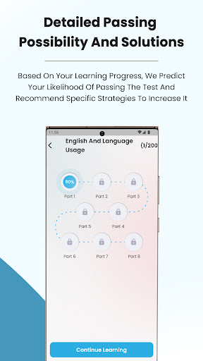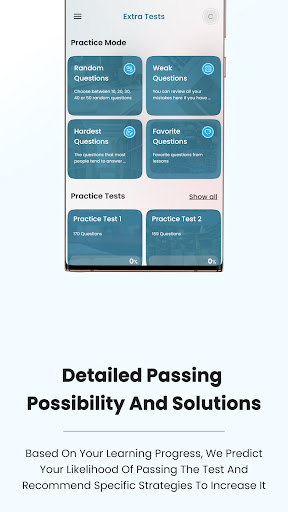 • 조롱 테스트 : 다양한 전체 테스트를 통해 테스트 형식에 익숙해 지도록 할 수 있습니다.테스트를 마치면 점수를보고 모든 질문을 검토합니다.