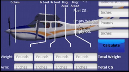 Calculate your small aircraft39;s weight and balance with this handy app All arms are saved automatically, so you do not have to reenter all the data from you POH. This tool was made specifically for a Cessna 172, but it should work for all aircraft that have 3 or 4 basic sections. Looking up charts will still be necessary in this version to come in version 4.0. EnjoyWARNING This calculator is for reference ONLY. Always consult your aircraft39;s weight amp; balance and the POH to calculate the weight and balance. This app does not replace either document.