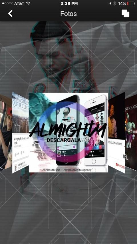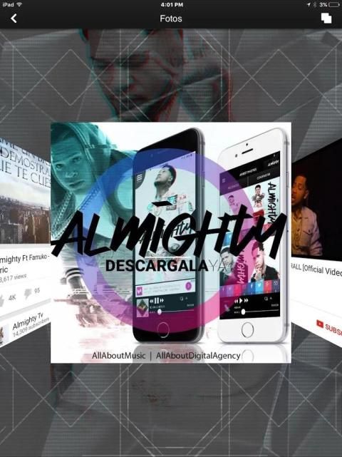Sigan a Almighty en su App Oficial. Baja el App gratis de Almighty para escuchar su música. Super sencillo, solo instala y escucha sus canciones, ve sus videos, Chatea con otros fans y en ocasiones con Almighty. Tambien podras ver fotos y mantenerte al tanto de todo lo relacionado con Almighty. ¿Que esperas" Descargala Ya.