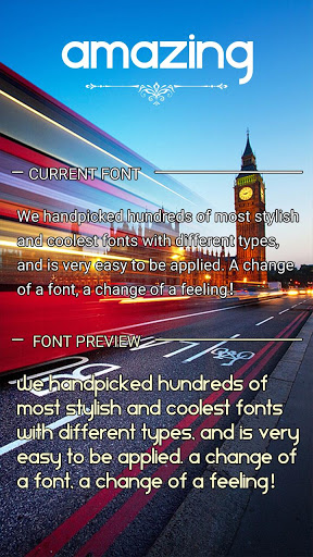 Android FlipFonts 용 글꼴 팩을 사용하여 기기의 서체를 무료로 변경할 수 있습니다. Samsung Galaxy에 설치된 FlipFont 글꼴 체인저 프로그램 사용 FlipFont 팩을 탐색하면 번들 글꼴 탐색기가 나타납니다. 취향에 맞는 놀랍고 완벽한 글꼴 스타일을 찾을 수 있습니다. 전체 전화 글꼴을 Amazing로 변경하십시오. 맞춤화 된 글꼴을 사용하십시오.Amazing의 기능은 호환 기능입니다. 이제 자신의 휴대 전화의 결정자가되어야합니다. 그리고 Hifont 앱을 통해 Amazing와 같은 다른 글꼴을 검색 할 수 있습니다.
