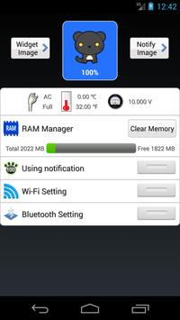 이 귀여운 앱은 알림 바에있는 장치의 배터리 수준을 보여줍니다. 특징 : - 배터리로 배터리 수준을 표시 할 수 있습니다.상태 정보. - 스마트 RAM 관리자 - 메모리 청소. - WiFi, Bluetooth의 경우 쉬운 설정. - 나머지 배터리. - 상태바 알림.