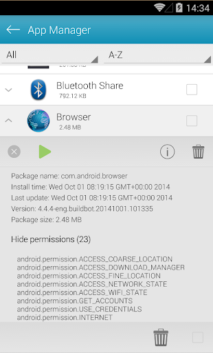 App Manager provides detailed view of all installed apps. Find large apps or apps with multiple permissions quickly and delete them instantly.
