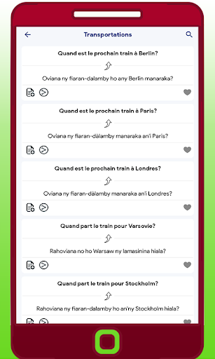 Malgache Francais est Gratuit pour tous les utilisateurs. Vous pouvez apprendre des phrases et des phrases complexes en un rien de temps. Vocabulaire Francais Malgache l'application est utile pour les hommes d'affaires et les voyageurs d'apprendre les rudiments de la langue étrangère. Les utilisateurs peuvent apprendre la langue malgache et sa meilleure façon d'apprendre les alphabets Malgaches et la grammaire pour les débutants. Proverbe Malgache est également utile pour apprendre les verbes et le vocabulaire. Il fonctionne efficacement en ligne ainsi que hors ligne.
