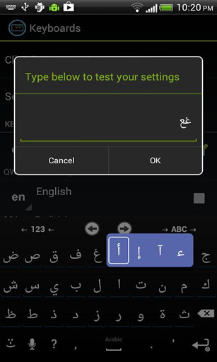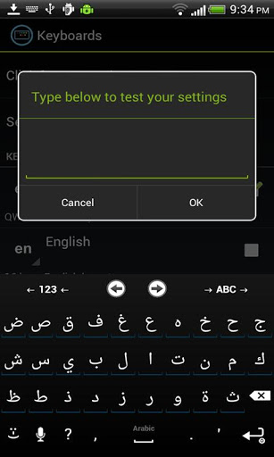 Arabic Keyboard is an on screen keyboard with multiple languages support.This is one of the most customizable keyboard available.Its a Trial version. Need to purchase license after that.Main features:* Multi languages keyboard support via external packages* Completion dictionaries for multiple languages* Change Language while typing* Also completes your typed words from you contacts names (in Android 2 0+)!* Multi Touch support* Extension keyboard (swipe your finger all the way up out of the keyboard)* Voice Input support (Android 2.2+)* Gesture support: ** Swipe left or right to switch layouts** Swipe up to shift** Swipe down to close the keyboard* Theme support (comes with 3 skins)* Build-in user dictionary words editor* And many more features!* Full featured standard layoutsFull Language Support Through External download through iKey app Keyboard Add ons:ʘ Arabic - AR - اللغة العربية‎ with Dictionaryʘ Armenian - HY - Հայերենʘ Belarusian - BE - беларуская моваʘ Bangla - BN - বাংলাʘ Bulgarian - BG -- български език with Dictionaryʘ Catalan - CA - català with Dictionaryʘ Czech - CS - čeština with Dictionaryʘ Danish - DA - dansk with Dictionaryʘ Divhei / Maildivian - DV - ދިވެހިʘ Dutch -NL - Nederlands with Dictionaryʘ Esperanto - EO - Esperanto with Dictionaryʘ Finnish - FI - suomi with Dictionaryʘ French - FR - française with Dictionaryʘ Georgian - KA - ქართული with Dictionaryʘ German - DE - Deutsch with Dictionaryʘ Greek - EL - Ἑλληνική with Dictionaryʘ Hebrew -HE - עברית with Dictionaryʘ Hindi - HI - हिन्दीʘ Italian - IT - Italiano with Dictionaryʘ Kanada - KN - ಕನ್ನಡʘ Latvian - latviešu valoda - with Dictionaryʘ Lithuanian- LT - Lietuvių with Dictionaryʘ Norwegian -NO- norskʘ Persian / Fars -FA - فارسی with Dictionaryʘ Portuguese (PT) - PT - português with Dictionaryʘ Russian - RU - Русский язык with Dictionaryʘ Spanish - ES - Español with Dictionaryʘ Tamil - TA - தமிழ்ʘ Thai - TH - ไทยʘ Ukrainian - UK - українська мова with DictionaryMany more language features are comming soon...