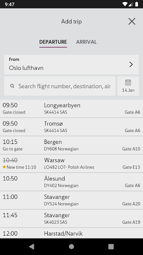 Avinor는 노르웨이의 모든 아바노 45 공항 모두에 대한 최신 비행 출발 및 도착 정보를 제공하는 공식 Avinor 앱입니다. ...에 미래에 오늘날 또는 더 나아가는 항공편을 검색하십시오. 또는 누군가를 집어 들었습니다.