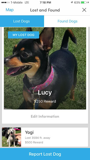 보고서를 잃어 버리거나 발견하고 개 사진, 세부 사항 및 연락처 정보를 통해 다른 사용자에게 마지막으로 보았던 곳을 기준으로
